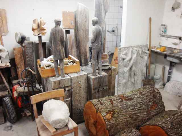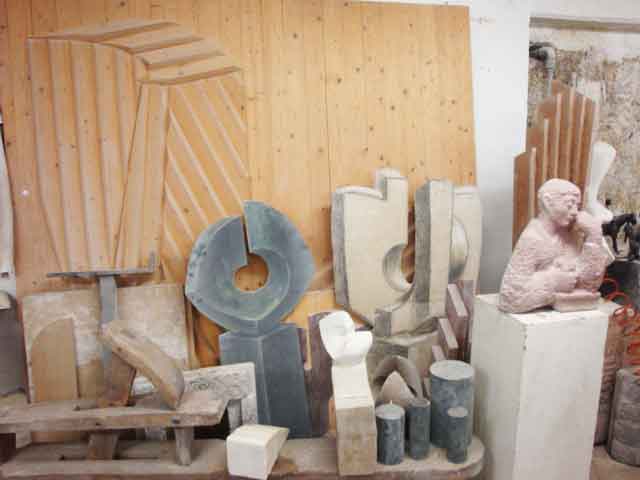 Skulpturen in Stein, Holz, Beton, Terracotta, Bronze, Zeichnungen und Lithografien.